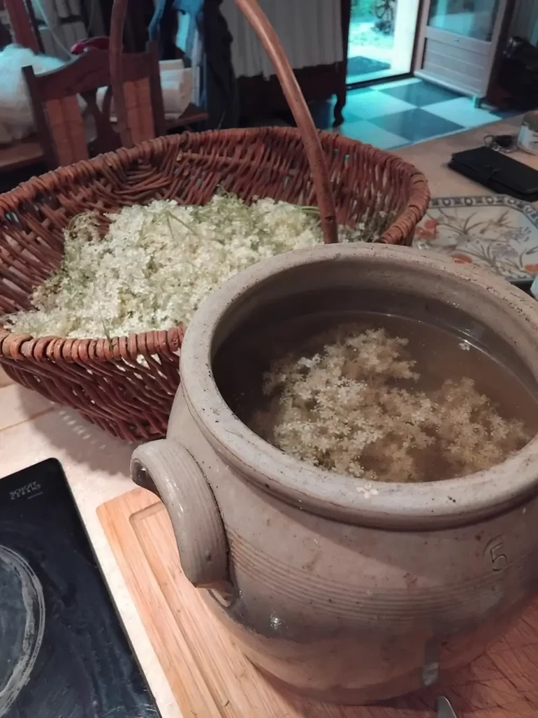 Là où je me trouve en ce moment (en Dordogne), c’est la pleine saison des fleurs de sureau. Et avec mon amie Catherine, nous en avons cueillies deux grands paniers. La plus grande partie est à sécher pour la deuxième recette et pour des projets ultérieurs… de la teinture végétale, entre autres.